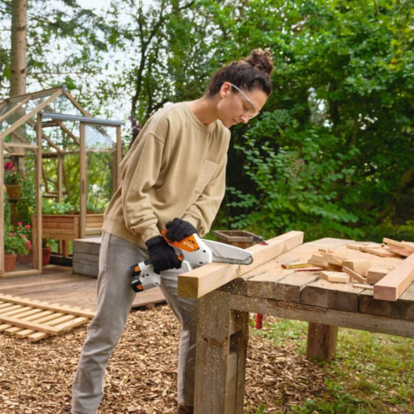 STIHL GTA 30 SET – компактная пила для расчистки кустарников, ухода за садом и пиления веток до 15 см в толщину. Бесщеточный мотор 400 Вт запитывается от двух аккумуляторов AS 2 напряжением 10,8 V и емкостью 2,1 Ah. Длина шины составляет 15 см, ширина паза – 1,1 мм. Цепь имеет шаг 1/4″ и развивает скорость до 8 м/с.