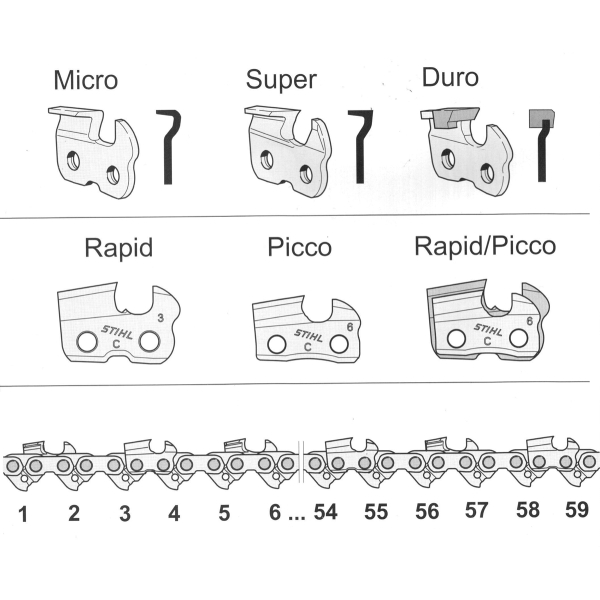 - Ланцюг STIHL 63 PD3 з кроком 3/8 дюйма (9,32 мм), товщина ведучого ланцюга 1,3 мм, має 50 ланок для шин 35 см.