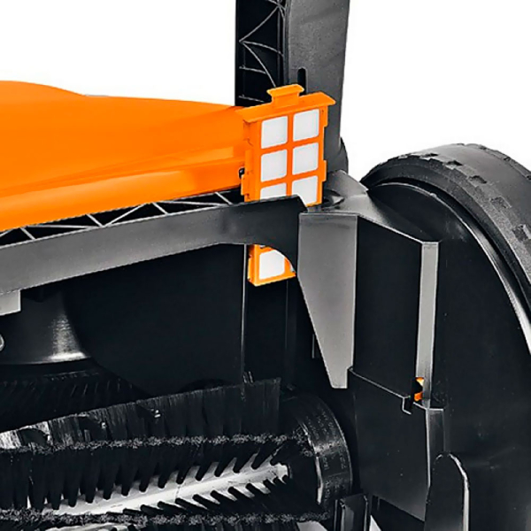 - Двойная щетка с системой MultiClean улавливает даже самый мелкий мусор, включая влажные листья и мелкие камешки.