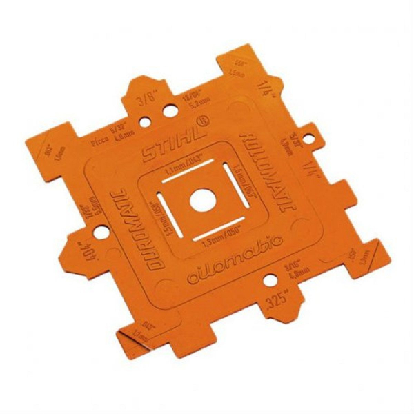 - Шаблон STIHL для контроля режущей гарнитурыю. Позволяет измерять шаг цепи и звездочки, толщину звена и ширину паза.