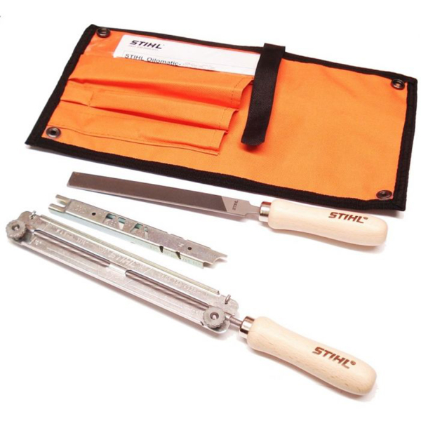 - Заточувальний набір STIHL складається з круглого напилка 5.2 мм, тримача, плоского напилка, шаблону.